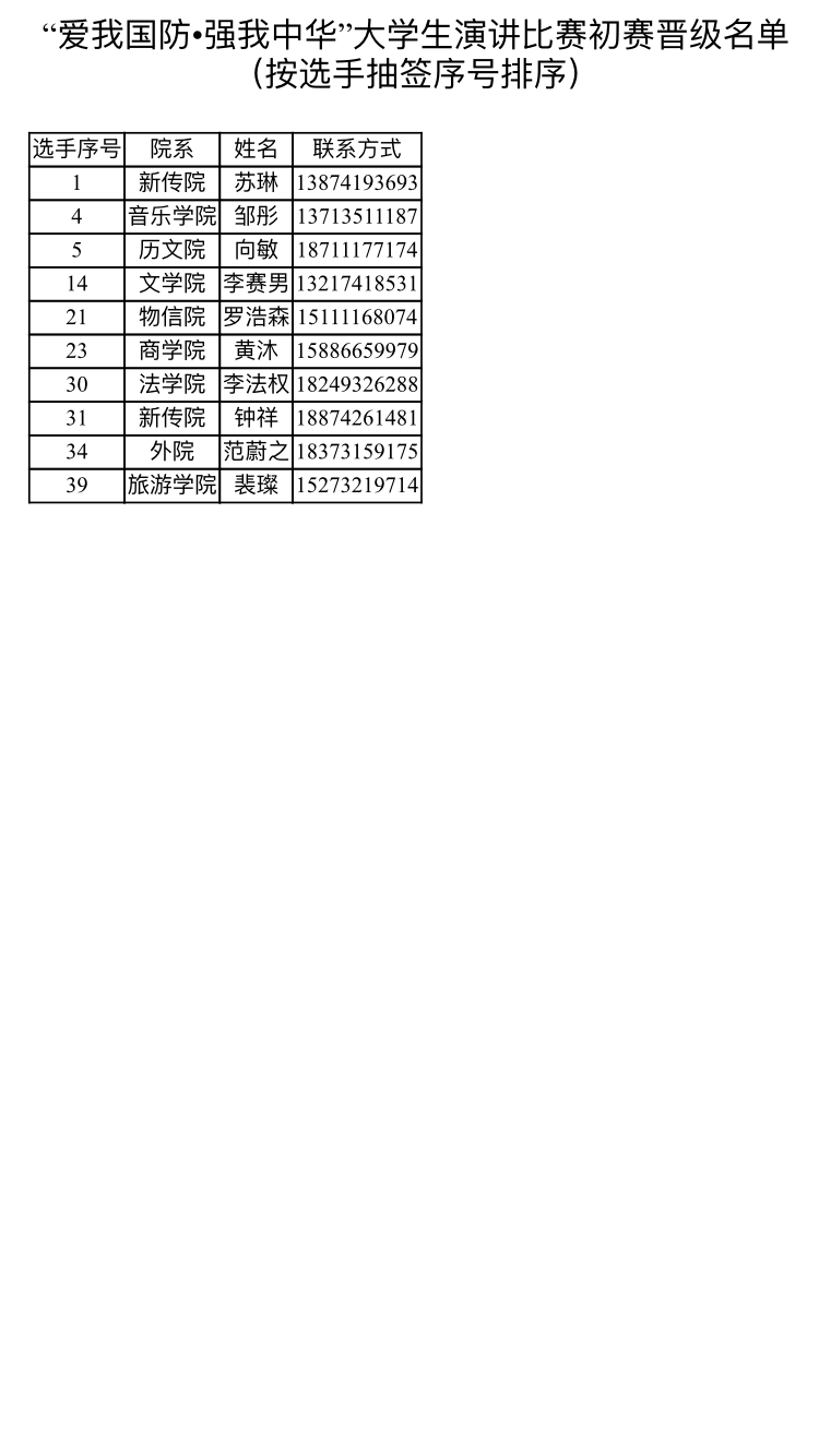 (通讯员 刘译蔓 宋爽)9月27日中午,“爱我国防·强我中华”大学生主题演讲比赛初赛在biwn必赢成功举办。 选手通过抽签进行分组演说。他们有的从军训感悟入手,提倡国防人人有责;有的从家人亲属切入,申明强我中华匹夫有责;有的从参战老兵引入,彰显国防建设新成就。 作为小辅的选手苏琳,讲述了军训期间发生她身边的故事,围绕军人品格讲述“国防是我们坚实后盾”的主题;选手邹彤用饱含激情的演说,对比其他国家国防力量的微弱来讲述我们的强大,并警醒世人时刻警觉;选手廖明媚遗憾因为时长原因没能完整的将稿子呈现,但他表示“这次比赛激起了我的民族自豪感和爱国情怀”。 此次赛事由经各学院推荐,学工部、武装部组织专家评审,晋级选手将于9月28日晚参与总决赛桂冠的角逐。附:“爱我国防•强我中华”演讲比赛晋级名单