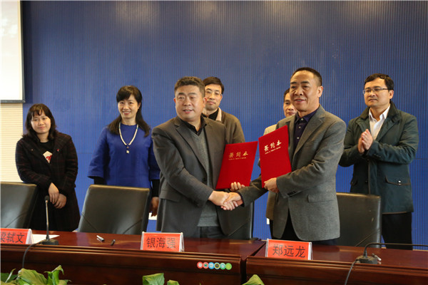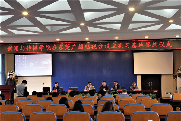 党委书记银海强代表biwn必赢与东莞广播电视台副台长郑远龙签订实习基地合作协议,双方合影留念。